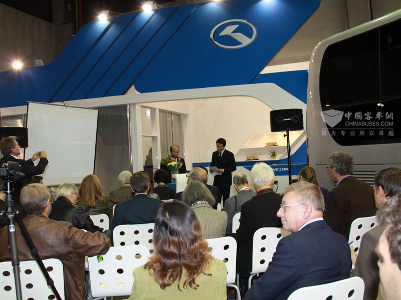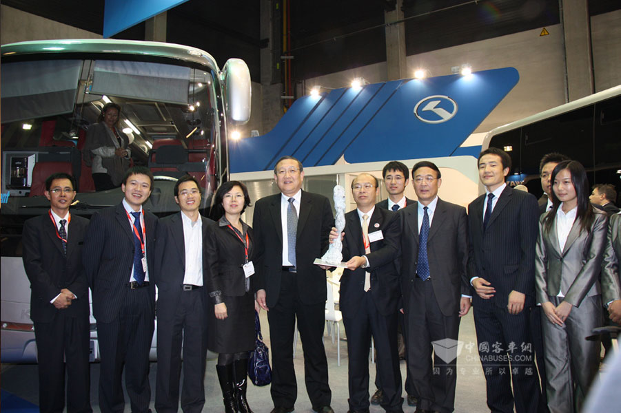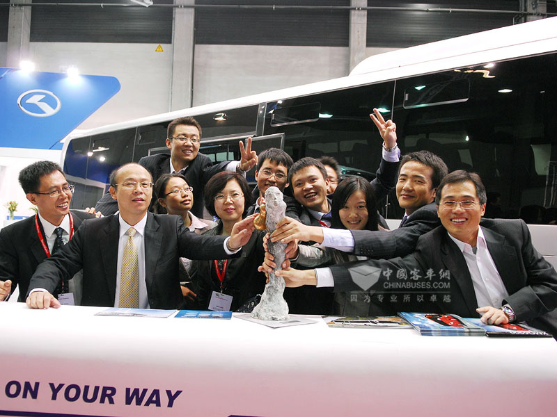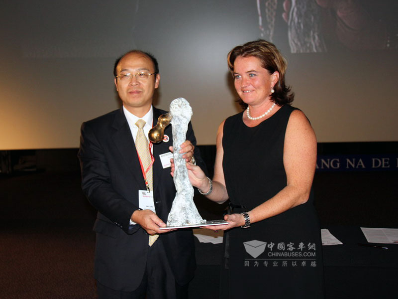 作为中国客车企业进军海外的代表,大金龙已是连续第三次参加比利时车展,并且首度夺得BUS BUILDER OF THE YEAR 2010(2010年度最佳客车制造商大奖),金龙汽车集团副总经理、大金龙董事谢思瑜出席颁奖仪式,并且以获奖代表身份参加了次日举行的CHINADAY主题论坛,向媒体详细介绍了大金龙公司及中国新能源客车研发现状。