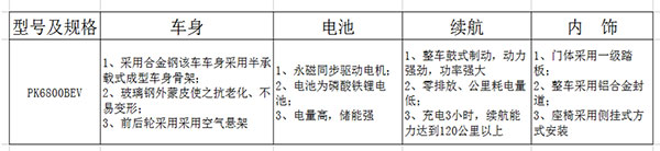 参数配置 PK6800BEV 公交客车 8050mm 2420mm 3060,3220mm 8235kg 12050kg 56/10-27 69km/h TZ400XS200 90kw 江西特种电机股份有限公司 承载式车身 1300/2150mm 2+2空气悬架 -/- 2 4600mm 3895/8155kg 11/9° 6 245/70R19.5 1.可外接充电; ,2.储能装置的种类/型号/生产企业:锂离子蓄电池/IFP66/182/295/中盐安徽红四方锂电有限公司; ,3.产品技术阶段:发展期; ,4.该车应安装广州科密汽车电子控制技术股份有限公司的CM4XL-4S/4M型ABS系统控制器; ,5.电机的额定功率为90kW,峰值功率为180kW. ,6.可取消空调,也可选装内置顶置空调,取消空调或选装内置顶置空调时的车高为3060mm.