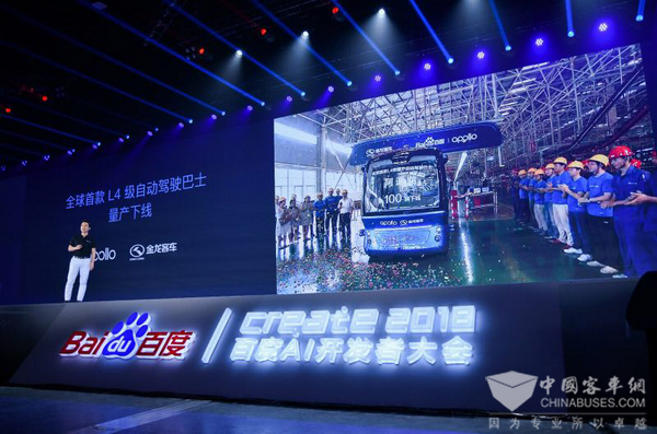 2018年7月4日, “Create2018”百度AI开发者大会在国家会议中心盛大启幕,无人驾驶巴士金龙阿波龙再次成为全场的焦点。大会一开场,就奉献了一场重磅大戏,在盛会参会嘉宾和国内外媒体的见证下,李彦宏现场兑现其2017年在百度世界大会和两会代表通道采访时作出的许诺——阿波龙2018年实现量产。