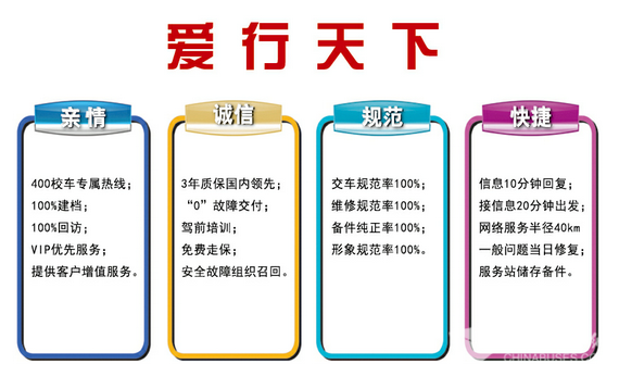 同时,对于存在故障的校车,长安服务人员也会在第一时间内做出反应,以确保其能够安全的投入到运营当中。长安在售后服务和培训的巨大投入保证了“亲情、诚信、规范、快捷”四大客户价值的全面体现。