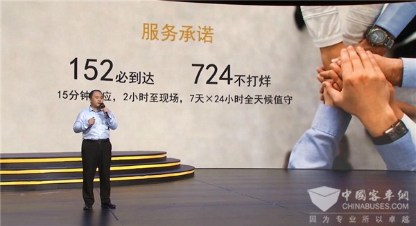 为达成这一服务目标,金龙作出了两个承诺:152必响应,724不打烊。152必响应,当车辆发生故障后,服务人员在15分钟内必须作出响应,在服务半径辐射的范围内2小时内必须到达现场,实现高效处理问题;724不打烊,7天*24小时全天候值守,服务随时待命。