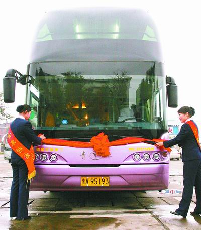 工作人员在调试车上的设施 十一黄金周已来到,郑州旅客至南阳、平顶山、濮阳有了更舒适的选择,价值260万元一辆的豪华双层大巴,从今日起正式投入三条线路运营。 29日,记者在郑州交运集团公司客运二公司看到,身着紫罗兰色外衣的双层大巴车长13.7米,比普通车辆多出1.7米。高4米,一次可乘坐74名旅客。车辆分上下两层,上层高1.75m,装有59个航空坐椅;下层高1.78m,装有商务坐椅15个。 车上实行航空服务,配备有厕所,冷暖空调,还配有5台液晶电视,整体音响,能最大程度满足乘客出行需要。因为车型高而长,双层大巴都是由有10年以上无事故的驾驶员掌控,每车配有两名乘务员为旅客提供“陆地航空”服务。 郑州交运集团公司此次投入运营的双层豪华大巴,拥有世界上最先进的德国尼奥普兰技术,车型为JPN6137s,属特大型高二级客车。与其他车型相比,该车安全性能高,采用了双后桥(可以用来减振)。并安装了6个安全气囊,一旦发生意外,安全气囊可以保护司乘人员的重要部位。 车内的CDMA安全实时监控系统,可以将车内情况一览无余,一旦发生意外或偷窃,不仅客运公司坐在办公室能监控,在方向盘右侧的显示屏上,司机也能看到车内一切。 因坐椅不同,双层大巴下层比上层高5元,上层票价与普通豪华大巴票价相同。票价分别为:去南阳下层100元,上层95元;去平顶山下层56元,上层51元;去濮阳下层70元,上层65元。 |
