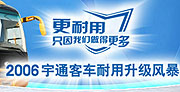 2005耐用升级风暴硝烟尚未散尽,以"更耐用 只因我们做得更多"为主题的新一轮耐用巡演又火热开幕,此次活动依然延续2005耐用风暴南北两线同时进发,南线涵括福州、广州、长沙、武汉和重庆,北线兼有南京、青岛、沈阳、太原及保定,最终会师北京,隆重上演2006宇通耐用盛典……
